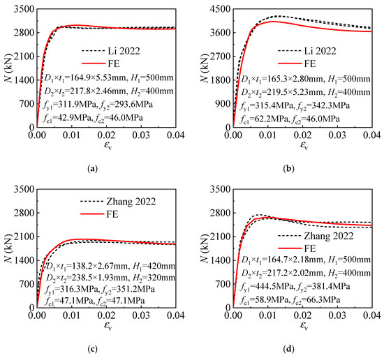 Comparison of the load(N)–longitudinal strain(εv) curves of the test [37,38] and FE model: (a) TF-5.5-2.5; (b) TF#-2.75-5.5; (c) T-II-2.5-1.5-50; (d) T-I-2.5-2.0-50.