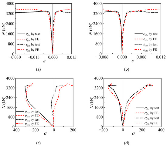The strain and stress component of the tubes in the T-CFST stub column is the basis for illustrating the confinement mechanism, and the tested and calculated results are compared in Figure 5. εs1v and εs1h are the mid-height cross-sectional inner tube longitudinal and horizontal strain, respectively, while εs2v and εs2h are the corresponding values of the outer tube. σs1v and σs2v are the inner and outer tube longitudinal stress, while σs1h and σs2h are the horizontal stress. Both the strain and stress development of the tubes can be predicted precisely by the FE model, and all the tested and calculated curves agree well with each other. The comparison again validates the accuracy of the FE model in illustrating the mutual influence of different components and the working mechanism of the axially loaded T-CFST columns.
