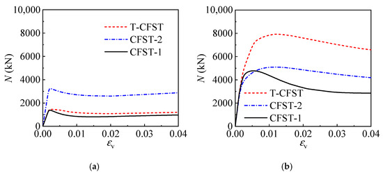 With a lower steel ratio (α = 8.5%) employed, inadequate concrete confinement is obtained for CFST-1. The compressive strength is only 5900.4 kN, and then the axial load drops rapidly, indicating the poor deformation ability of CFST-1 (Figure 6). By increasing the steel ratio to 14.8%, enhanced concrete confinement is achieved for the CFST-2, leading to a 32.0% higher strength. Comparatively, the T-CFST column with the steel ratio of 14.4% achieves a significantly improved compressive strength of 9055.2 kN, which is 53.5% and 16.2% higher than CFST-1 and CFST-2, respectively. Meanwhile, compared to the CFST-1 column, both the CFST-2 and T-CFST column achieve better ductility.