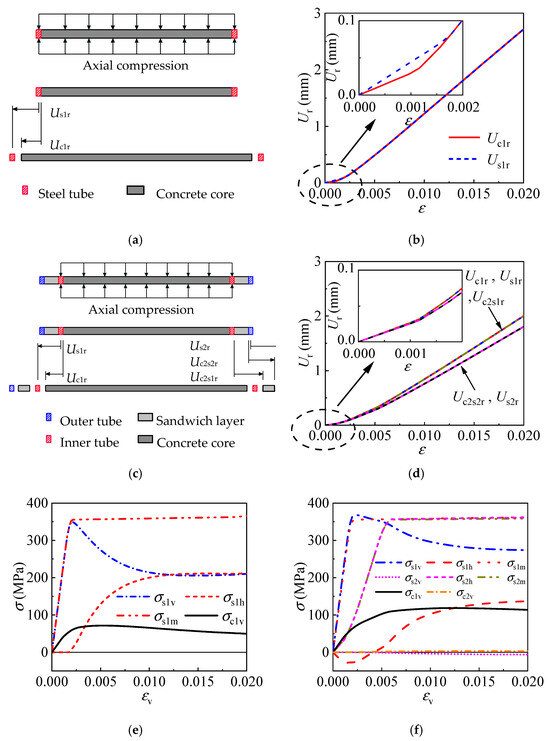 The internal CFST is restrained effectively by the outer tube for the T-CFST, leading to significantly enhanced compressive strength and ductility. To better understand the confinement by the outer tube, the difference in the confinement mechanism of the T-CFST and ordinary CFST column will be further compared and discussed in depth. The radial deformation and stress development of the two kinds of columns are shown in Figure 8, in which Ur is the radial deformation; Uc1r, Us1r, and Us2r are the radial deformation of the concrete, inner tube, and outer tube, respectively; Uc2s1r and Uc2s2r represent the radial deformation of the sandwich material adjacent to the inner and outer tube. At the very beginning of loading for CFST-1, a larger Poisson’s ratio of 0.3 is achieved for the steel material compared to the concrete material (0.2), and the tube undergoes greater radial deformation than the concrete core and they are separated as shown in Figure 8b. At this stage, no concrete confinement is provided by the tube (Figure 8e). As the loading continues, the concrete core begins to develop plasticity and the radial deformation increases rapidly; the tube and concrete expand consistently as the axial strain reaches 0.018; after that, the two portions begin to deform cooperatively, and concrete is confined by the tube, and the tube achieves equivalent stress of 0.947fy1; with further increase in the axial strain, the tube hoop stress keeps increasing while its longitudinal stress decreases rapidly as shown in Figure 8e. However, no axial load is directly sustained by the outer tube for T-CFST, hence producing almost no radial deformation, while the internal CFST bears the axial load and produces radial deformation, pushing the external jacketing to develop radial deformation cooperatively. Therefore, the concrete confinement is derived and developed (Figure 8d); after that, the outer tube hoop stress increases rapidly until the outer tube yields (Figure 8f); then, the outer tube hoop stress remains unchanged, whereas the inner tube hoop stress begins to increase rapidly, providing continuously improving concrete confinement. Moreover, the sandwich material sustains the confining stress by the outer tube horizontally, leading to radial compressive deformation. The radial deformation difference between the sandwich material adjacent to the inner and outer tube also increases gradually as the confinement by the outer tube improves (Figure 8d). The above comparison reveals that the concrete is confined by the tube only after developing plasticity for the CFST, and the confinement is quite small. However, for the T-CFST column, concrete confinement by the outer tube is developed at the very beginning of loading; at the same time, the outer tube can be yielded horizontally, leading to greatly enhanced concrete confinement and significantly improved mechanical properties of the T-CFST column.