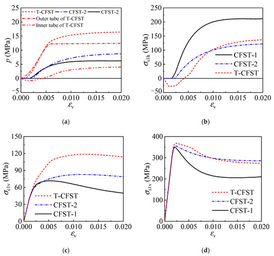 Stress development of the different portions: (a) concrete confining stress; (b) inner tube hoop stress; (c) concrete longitudinal stress; (d) inner tube longitudinal stress.