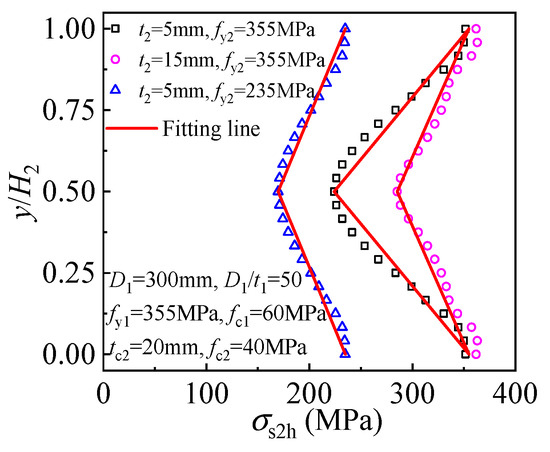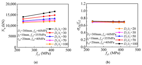 The effect of the outer tube yield strength gradually enhances as its thickness increases (Figure 25a). When the outer tube thickness is within 7.5 mm, its yield strength almost has no influence on the ratio of the outer tube hoop stress and the yield stress σs2h/fy2. However, when the thickness exceeds 7.5 mm, an improved ratio of the outer tube hoop stress and yield strength σs2h/fy2 is achieved as the outer tube yield strength increases.