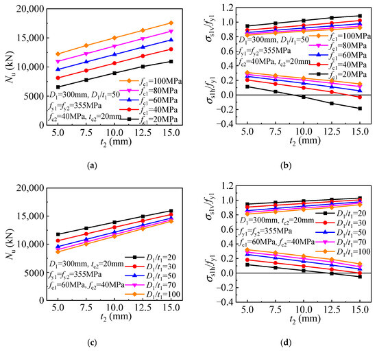 Influence of the inner tube diameter-to-thickness ratio: (a) Compressive strength (t2 = 10 mm); (b) Inner tube stress (t2 = 10 mm); (c) Compressive strength (fc1 = 60 MPa); (d) Inner tube stress (fc1 = 60 MPa).