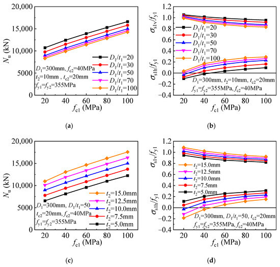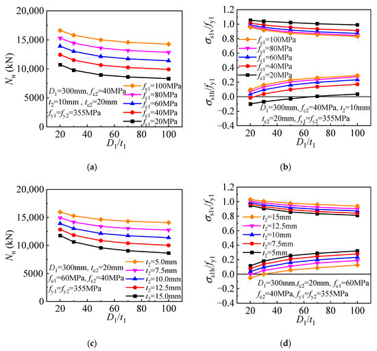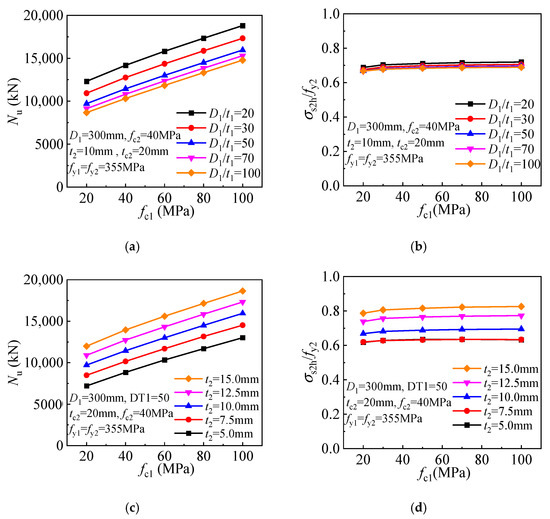 Influence of the inner tube diameter-to-thickness ratio: (a) compressive strength (t2 = 10 mm); (b) outer tube hoop stress (t2 = 10 mm); (c) compressive strength (fc1 = 60 MPa); (d) outer tube hoop stress (fc1 = 60 MPa).