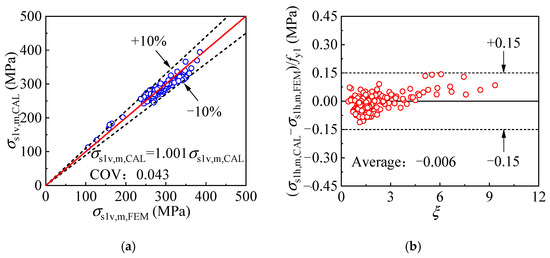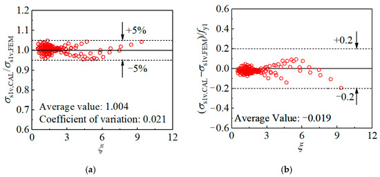 The axial load sustained by the internal CFST portion can be determined by considering the contribution of both the inner tube and core concrete, and the inner tube longitudinal stress σs1v,m, and hoop stress σs1h,m can be calculated by Equations (16) and (17), respectively. The comparison of the inner tube stress components obtained by the equations and the FE model is depicted in Figure 28, where σs1v,m, CAL and σs1v,m, FEM is the longitudinal stress determined by the formula and FE model, while σs1h,m, CAL and σs1h,m, FEM is the hoop stress given by the corresponding methods. The difference between σs1v,m, FEM and σs1v,m, CAL is no more than 10%, with the average ratio of the two values being 1.001 and the coefficient of variation being 0.043. Meanwhile, the difference between the inner tube hoop stress determined by the equation and the FE model is less than 0.15fy2, with an average error of 0.00 fy2. The above comparison reveals that the calculation methods are satisfactory in calculating the stress components of the mid-height inner tube.