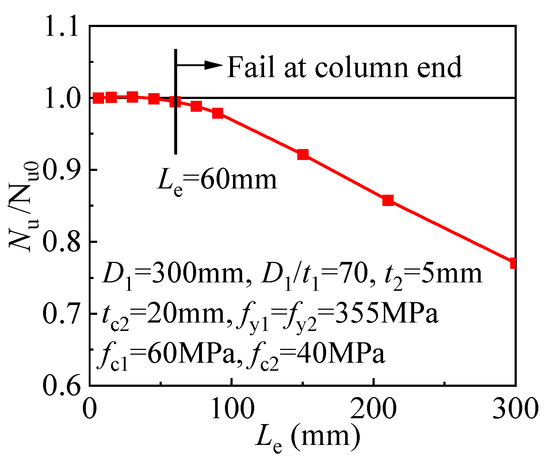 The compressive strength is given and compared in Figure 12 for columns with different thicknesses of sandwich layer and outer tube. Nu0 is the compressive strength of the column with a sandwich layer thickness of 10 mm. Within a certain range of sandwich layer thickness, the strength of the columns does not correlate with this thickness. However, when the sandwich layer thickness exceeds this range, the further increase in thickness will significantly reduce the bearing capacity. For the T-CFST columns employing outer tubes of different thicknesses, there is also a difference in this range. Specifically, for columns with outer tube thicknesses of 5 mm, 10 mm, and 15 mm, the range limit values of this sandwich layer are 100 mm, 70 mm, and 30 mm, respectively. Due to the sandwich layer in the T-CFST column mainly transferring the confinement, the sandwich layer thickness is suggested to be reduced as much as possible while ensuring pouring quality. Within the scope in this paper, a thickness of no more than 30 mm is suggested.