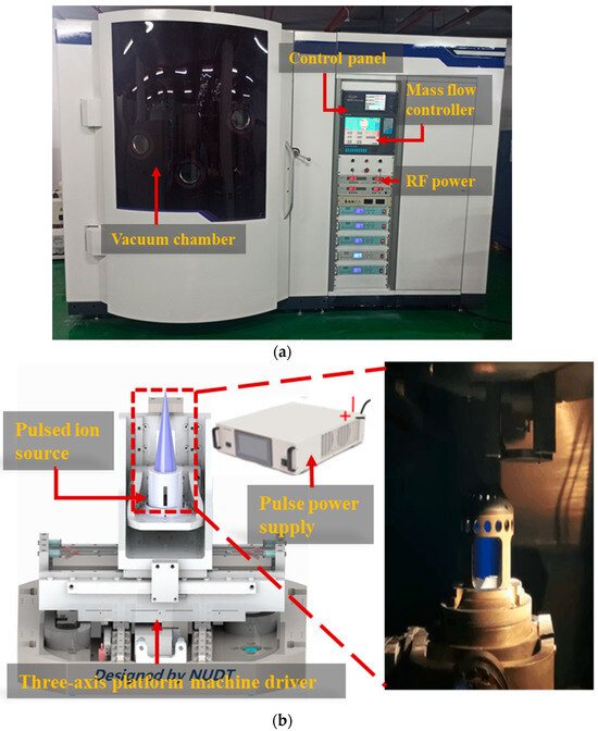 Physical diagram and schematic diagram of the pulsed-ion-beam etching equipment. (a) NUDT-IBE700 equipment. (b) Pulsed ion source model schematic diagram and pulsed ion source device physical diagram.