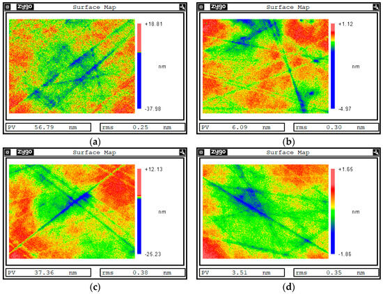 Surface white light interferometer test results of sample 2 with a quantum-dot sacrificial layer. (a) Surface area a of the sample before sputtering. (b) Surface area b of the sample before sputtering. (c) Surface area a of the sample after sputtering. (d) Surface area b of the sample after sputtering.