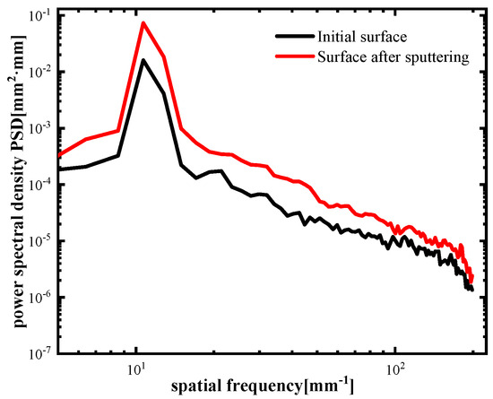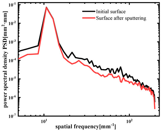 The process of ion-beam sputtering of the single-crystal silicon carbide surface has both surface smoothing and rough effects. The experimental results in Figure 5 also verified this theory. When the effect of viscous flow and elastic diffusion on the surface of sputtered single-crystal silicon carbide cannot eliminate the influence of the roughness effect, the roughness effect plays a leading role, the surface quality will deteriorate, and the roughness will increase, as shown in Figure 5c,d. RMS increased to 0.38 nm and 0.35 nm. The PSD curve in Figure 6 also shows that the error in the surface’s middle- and high-frequency bands after ion-beam sputtering deteriorated.