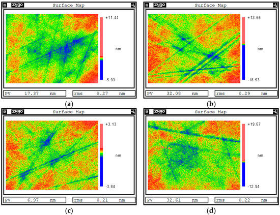 Detection results of white light interferometer on the surface of sample 1. (a) Surface area a of the sample before sputtering. (b) Surface area b of the sample before sputtering. (c) Surface area a of the sample after sputtering. (d) Surface area b of the sample after sputtering.