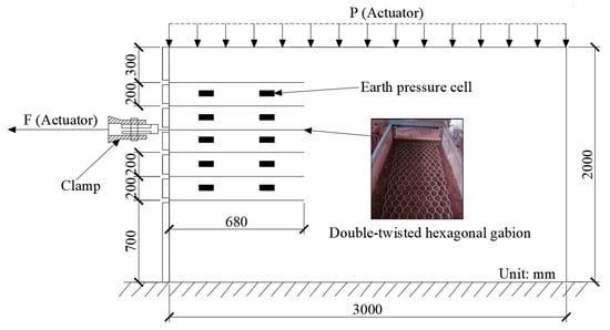 The pullout test was conducted in a large model box in Central South University, Changsha, China, as shown in Figure 1. The dimensions of the model box were 3.0 m (length) × 0.85 m (width) × 2.0 m (height). One side of the model box was installed with transparent organic glass to observe the whole pullout test process. The other sides were welded of channel steel and steel plates for sufficient rigidity. To facilitate the pullout test, six layers of a gabion mesh were arranged along the height in the model box, and the spacing between two adjacent layers was 0.2 m. The first layer was 0.3 m from the top of the model box, and the last layer was 0.7 m from the bottom of the model box to reduce the boundary effect. There were two actuators for applying loading. One vertical actuator was fixed at the top of the model box to apply the vertical loading. The other horizontal actuator was adopted to apply the horizontal tensile force through the clamping system at a speed of 0.05 mm/s [36]. A Baylor beam was set at the top of the model box to produce uniform loading. The horizontal actuator could be moved up and down as required. By adjusting the vertical loading provided by the actuator at the top of the model box, the normal stress at the interface between the gabion mesh and the filler could be changed as required. However, due to the influence of frictional resistance on the sides of the model box and the self-weight of the soil, the normal stress on the surface of the gabion mesh could not be well controlled by the vertical actuator. Consequently, it is necessary to set two soil pressure cells in each layer to accurately determine the normal stress on the surface of the gabion mesh.