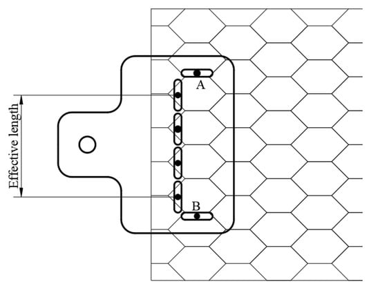 The conventional clamping system cannot well fix the hexagonal gabion mesh, and it may produce a “necking phenomenon” during the pulling process and enlarge the measured displacement of the gabion mesh. In order to reduce the “necking effect”, an improved clamping system was developed in the pullout test, as shown in Figure 2. Two identical clamping jigs with two holes (A and B) were used to clamp the gabion mesh, and each hexagonal mesh within the effective length of gabion clamping was fixed tightly with bolts. The lateral constraint at both sides within the effective length can well limit the transverse deformation of gabion mesh and subsequently reduce the “necking effect”.