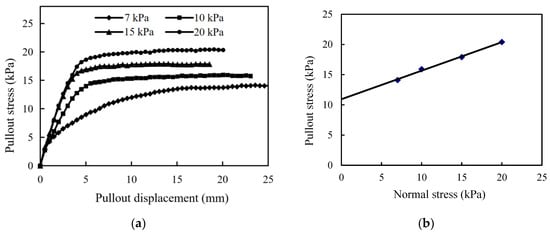 (a) Pullout stress versus displacement and (b) shear stress versus normal stress in pullout test.