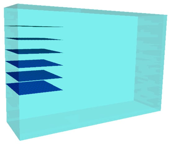 The numerical model of reinforcement and filler can be established to extend the interface characteristic of the gabion mesh and the filler. Based on the above-mentioned pullout test model, a 1:1 numerical model of the gabion mesh and the filler was established based on FLAC3D 6.0 platform. The size of the numerical model is 3 m × 0.85 m × 2 m, as shown in Figure 4. Corresponding to the laboratory pullout test, the spacing of reinforcing material is 0.2 m, and no reinforcing material is set at a depth range of 0–0.3 m from the top of the model, and no reinforcing material exists within a depth range of 0–0.7 m from the bottom of the model either.