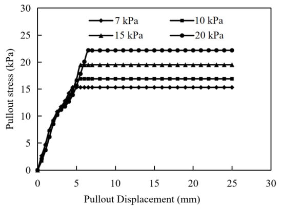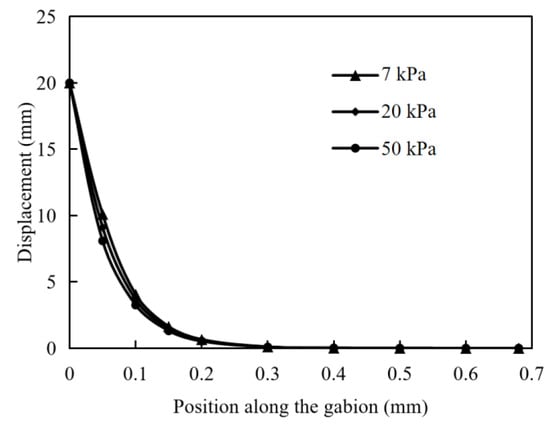 In the numerical simulation with normal stresses of 7, 20 and 50 kPa, the distribution of displacement curves along the gabion is shown in Figure 8. Under different normal stresses, the displacement distribution versus length of reinforcement is exactly the same. As the pullout displacement in the numerical simulation increases, the normal stress only determines the magnitude of the shear stress at the reinforcement and soil interface and does not affect the displacement distribution of the reinforcing material. It is considered that the normal stress only affects the difficulty of pulling the reinforcement out of the soil and does not affect the behavior of the reinforcement against the pulling force.