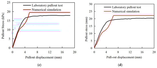 Pullout curves of laboratory pullout test and numerical simulation under different normal stresses. (a) 7 kPa; (b) 10 kPa; (c) 15 kPa; (d) 20 kPa.