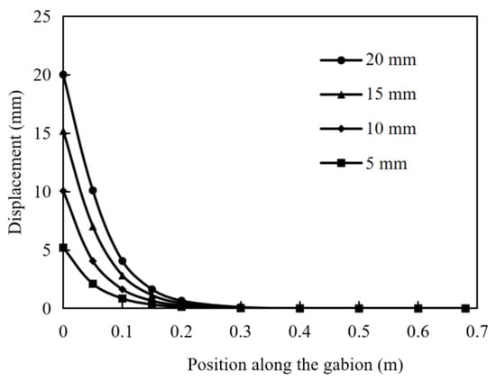 In the numerical simulation with a normal stress of 7 kPa, the distribution of the pullout displacement along the length of the gabion is shown in Figure 7. The displacement of the gabion decreases non-linearly along the length, which indicates that the decay of the pulling force mainly occurs in the outer part. As the pullout displacement increases, the displacement reduction rate of the gabion from the clamp to the interior increases, indicating that the pullout force attenuates more. The performance of gabion mesh is fully demonstrated near the clamp position of 0–0.2 m.