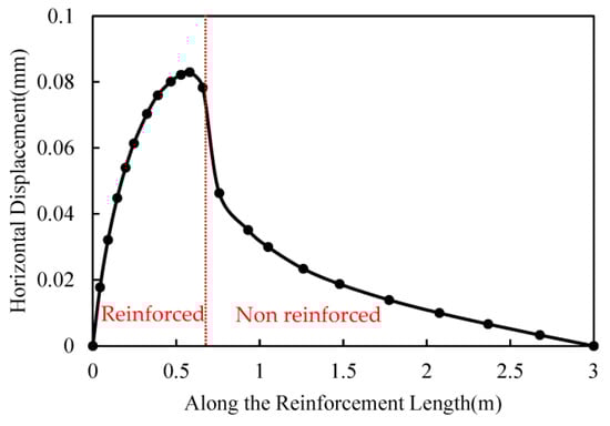 The horizontal displacement distribution of the soil along the length direction of the reinforcement in the plane of the pullout process is shown in Figure 10. The horizontal displacement distribution of the soil is in a “bell” shape along the length direction of the reinforcement. Under the action of interface friction between the reinforcement and the soil, the horizontal displacement of the soil gradually increases from the outside to the inside in the reinforced area. In the unreinforced area, the displacement of the soil gradually decreases from its maximum value to 0 in a slow trend. It is worth noting that the maximum horizontal displacement of the soil occurs near the end of the reinforcement soil contact surface, but not completely.