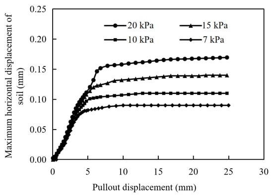 The peak node of the horizontal displacement of the soil is monitored, and the maximum horizontal displacement of the soil versus the pullout displacement under different normal stresses is shown in Figure 11. The shape of the horizontal displacement distribution remains constant with the increase in the pullout displacement, while the values are slightly different. Corresponding to Figure 5, the horizontal displacement of the soil increases with the increase in the pullout displacement in the rapid growth stage and keeps stable in the yield stabilization stage. As the normal stress increases, the maximum horizontal displacement of the soil also increases.