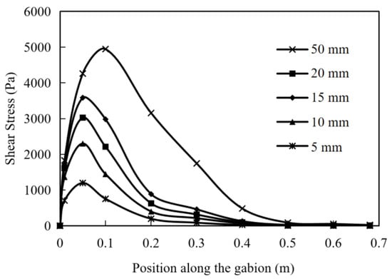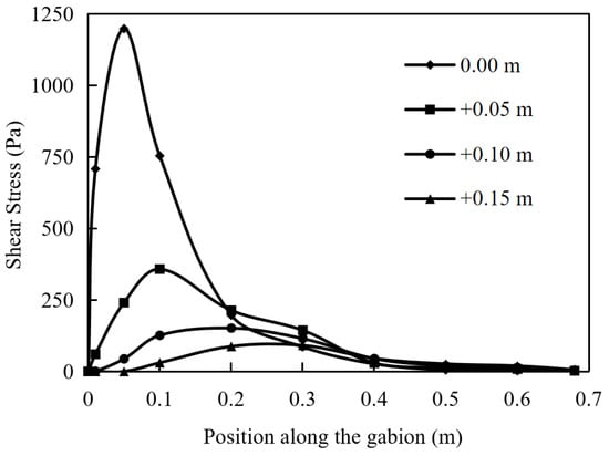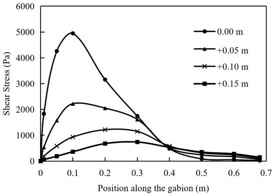 Shear stress of soil away from gabion of 0, 0.05, 0.10 and 0.15 m (pullout displacement: 5 mm).
