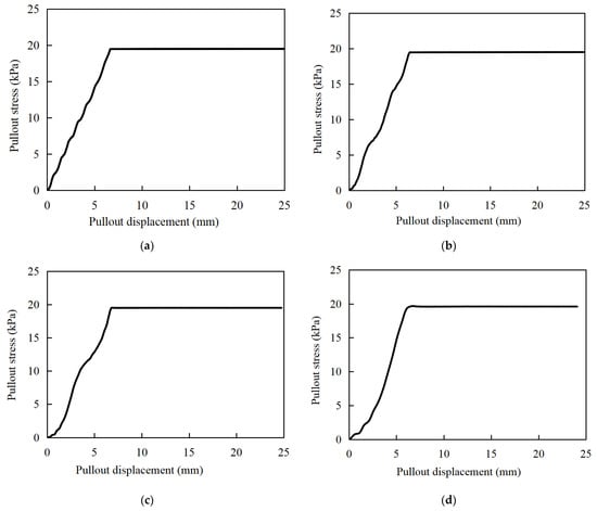 - Yield stabilization stage. When the pullout displacement of the reinforcement reaches a critical value, the shear stress remains constant. In this stage, the shear stress does not increase at all when the pullout displacement increases.