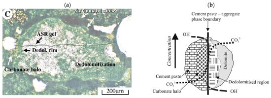 The alkali–aggregate reaction (AAR) is a harmful distress mechanism in concrete, resulting in a reduction in its performance and leading to a shortened service life. AAR can be divided into two main types of mechanisms: the alkali–silica reaction (ASR) and the so-called alkali–carbonate reaction (ACR); the former is more widely spread and understood. However, ACR in concrete presents many challenges since the mechanism of expansion and deterioration is not yet fully understood. In ASR-affected concrete, cracks begin within the aggregate and extend into the cement paste as the expansion increases. On the other hand, ACR-affected concrete is subjected to dedolomitization, which turns the dolomite into brucite and calcite (Equation (1)). However, these processes are said to not cause expansion or expansion-related cracks [], while it is believed that the mechanism causing cracks in such concrete is the presence of ASR [,,]. Dedolomitization (Figure 1b) is considered a harmless process by some researchers [,] although the so-called ACR can cause significant expansion and damage to concrete [,]. ACR can therefore be characterized by dark rims on the aggregate’s boundary (also visible in ASR-affected concrete) and a white carbonate halo around the aggregate in the cement paste (Figure 1a).