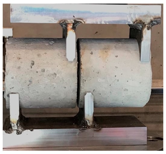 The direct shear resistance of the concrete specimens was captured using the set-up proposed by [] and more recently adapted to evaluate the effect of AAR with respect to the expansion level achieved [,]. Specimens were circumferentially cut at a depth of 21 mm [] using a masonry saw equipped with a notched diamond blade. The notch width was equal to the blade’s width of 5 mm, which ensures maximum resistance. The applied loading rate was selected to be 100 N/s since rates lower than this value did not influence the shear resistance, whereas faster loading rates resulted in an increase in the shear strength. The apparatus used is shown in Figure 3, and the maximum force at which the concrete specimen failed was converted into shear resistance using Equation (2), as follows: