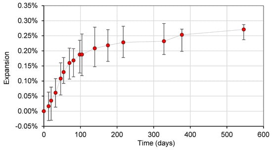 The average expansion as a function of time is shown in Figure 4, where an overall increase in the expansion can be observed. The data range bars represent the minimum and maximum achieved values at a given time, and the standard deviation for all measurements ranges from 0.021% to 0.035%. An expansion level of 0.05% was achieved at 27 days, while 43 days were observed to produce an expansion level of 0.12%. Interestingly, a plateau was reached between 217 and 328 days, at 0.23% of expansion, after which an increase in expansion occurred, reaching 0.27% after 546 days.