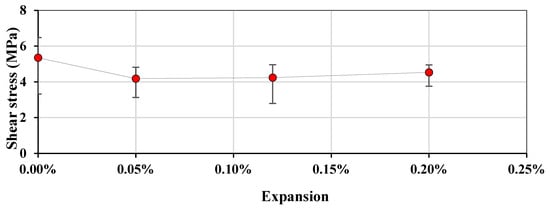 The direct shear resistance is shown in Figure 5, where each point represents the average of three specimens. A slight loss of shear resistance can be observed at 0.05% of expansion from initially 5.35 MPa to 4.18 MPa, after which the shear resistance increased at a constant linear rate up to 4.53 MPa at 0.20% of expansion. However, by visual comparison of the data range bars, the difference between the tests for each expansion level is not evident (extremities overlapping). This was further verified through a one-way ANOVA, which showed that there wasn’t a significant difference between the expansion levels (Table 4).