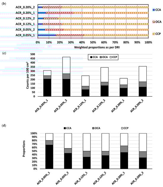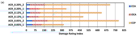 The damage rating index (DRI) was selected as a tool to quantify the damage features observed at a scale representative of the affected material. Figure 6a,b illustrates the comparison in the DRI numbers and weighted proportions, while Figure 6c,d shows the extended version of the DRI as per [], obtained in this study. For simplicity, the legend for the bar chart (Figure 6a) only shows the features that were observed in this study (CCA, OCA, and CCP). Traces (less than 1%) of products were observed; however, the distinction between polishing residue and a reaction product couldn’t be made. Two specimens were evaluated per expansion levels; however, the second specimen (labeled “_2”) was evaluated only after the first specimen (labeled “_1”). The decision to test a second specimen was made upon observing inconsistencies in the crack generation and propagation with reference to the expansion level. As such, the second specimens were stored for a longer period of time (i.e., 12 °C), which is considered efficiently capable of mitigating ASR damage []. Indeed, this mitigation was not effective for concrete affected by ACR, which can be further observed in [], where a non-negligeable DRI number was observed for specimens considered sound made with the Kingston-reactive aggregate.
