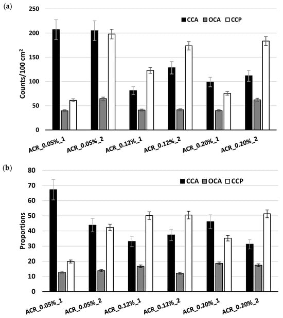 Another approach to visualizing the crack counts by adopting the concept of the extended version of the DRI, as proposed by [], is illustrated in Figure 7, in which the bars represent the features’ counts. Uncertainty bars of ±10% were further added to these counts to consider operator variability and further differentiate the results. In both cases, for the 0.05% expansion level, the closed cracks in the aggregates (CCA) were similar (207 and 205 counts/100 cm2), as observed by the overlapping means. However, these counts decreased for the two other expansion levels. Interestingly, the counts of the cracks in the cement paste (CCP) were very similar for each of the specimens labeled “2”, which was the specimen that was conserved and later tested (i.e., 198, 174, and 183 counts/100 cm2 for expansions of 0.05%, 0.12%, and 0.20%, respectively).