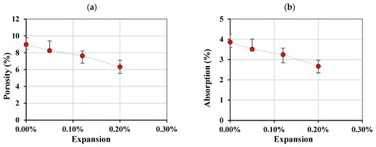 Figure 8a,b shows the apparent porosity and absorption, respectively, of the affected concrete with respect to the expansion level achieved. The absorption was calculated using the dry and surface-saturated dry (SSD) masses over the dry mass. Interestingly, both decreased as a function of expansion, whereby the apparent porosity for a sound concrete (assuming that AAR was inhibited when stored at 12 °C for 47 days) was 9% and linearly decreased to 6.3% at 0.20% of expansion. The same trend was indeed observed for the absorption, whereby the absorption decreased as a function of expansion.