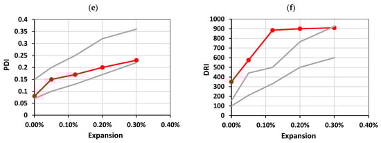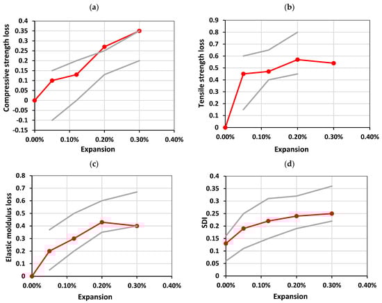Figure 9c–e shows the SDT outputs as modulus of elasticity reductions, SDI, and PDI as a function of expansion, respectively. The SDI values increased with expansion in a concave shape, where values between 0.13 and 0.25 were obtained from 0% to 0.30% of expansion. The PDI values were somewhat more linear as a function of expansion, with the exception of the PDI at 0.05% of expansion being close to that at 0.12% of expansion (i.e., 0.15 and 0.17, respectively). Moreover, the greatest loss in modulus of elasticity was observed at 0.20% at 43% reduction.