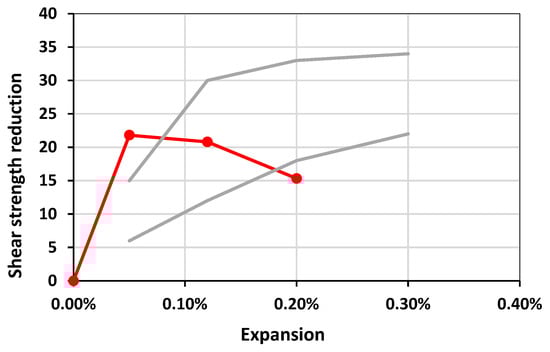 Figure 9a,b shows the compressive and tensile strength reductions as a function of expansion, respectively. The compressive strength reduced at a relatively constant rate up to 35% at 0.30% of expansion, while the tensile strength was mostly lost at the beginning of the expansion, where a drop of 45% was observed at 0.05% of expansion. Noticeably, the loss in tensile strength was greatest at 0.20% of expansion, yet the largest difference was between 0% and 0.05% of expansion.