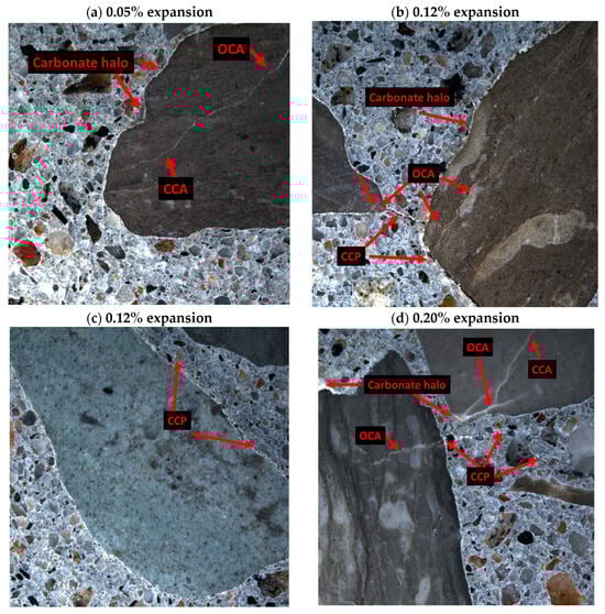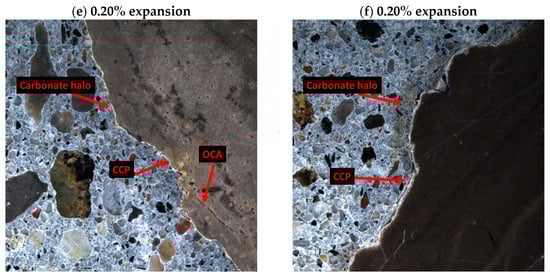 At 0.05% of expansion, evidence of ACR was observed through carbonate halos, where a white deposit was seen at the aggregate boundary (Figure 11a). Likewise, the ACR signatures became more prominent at 0.12% of expansion (Figure 11b), with more frequent carbonate halo observations and cracks in the aggregate–paste interface, linking open cracks in the aggregates to each other through the cement paste. Figure 11c shows a crack in the aggregate–paste interface where a halo was also observed, without an association to cracks in the aggregate. At 0.20% of expansion (Figure 11d), cracks in the aggregate were propagating from the aggregate to the cement paste, with a white discoloration at the sides of the cracks, which was observed in Locati et al. []. Interestingly, the cracks in the cement paste also showed the white edges along the crack, with some slight white discolouration in the open crack. Cracks in the aggregate–paste interface were more often observed, as well as in the bulk cement paste, with and without association to the cracks in the aggregate (Figure 11e,f). Moreover, cracks appeared wider as the expansion increased. Cracks generated in the aggregate appeared empty of any residue, indicating expansion from such cracks.