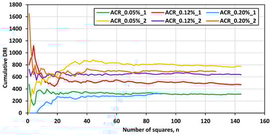 Due to reservations about the use of the DRI as an objective method to measure damage, a plot illustrating the cumulative DRI as a function of the sample size (number of analyzed squares) is presented in Figure 12. This plot helps establish the required surface area to be analyzed to obtain a representative sample. Generally, one may identify a sample as the number of physical specimens or cores tested. However, for an analysis in which features are counted, weighted, and their relative proportions compared, the area of analysis used to represent the overall captured damage must be established. The DRI therefore converges towards a mean after a certain number of squares are analyzed. It is to be noted that this convergence refers to the “law of large numbers”, and the sample size (n) at which the DRI converges differs for each test. Nevertheless, this plot serves as a starting point to objectify the DRI as a damage evaluation tool and provides some transparency in the results presentation.