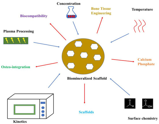 Several bioactive molecules are key in the bone remodeling process. Inflammation of implant site, immunogenicity, and instability of biomolecules themselves are just a few of the current challenges in BTE [7,8,9]. Several of the biomolecules, and the corresponding polymer they are often used with, have been extensively studied, for these applications. PDLA [10,11], BMP-2 [12,13] PDGP [14] TGF-B [15], and PLGA [16,17] are just a few of the polymers and biomolecules being used to addressed various problems in BTE. Low-temperature plasma offers a solution to modifying the surface chemistry of a polymeric scaffold, acting as a vehicle to transport these bioactive molecules to the surface of the polymer. This technique’s flexibility is demonstrated by the variety of applications, including surface modification [18], etching [19], modification of surface morphology [20], changing surface energy of a material [21], and others. Overall, several techniques, methodologies, and concepts can be implemented to optimize the biomineralization process. Figure 1 shows a schematic of some of the distinct factors that can be used to increase biomineralization on a scaffold and varied applications that occur as a result.