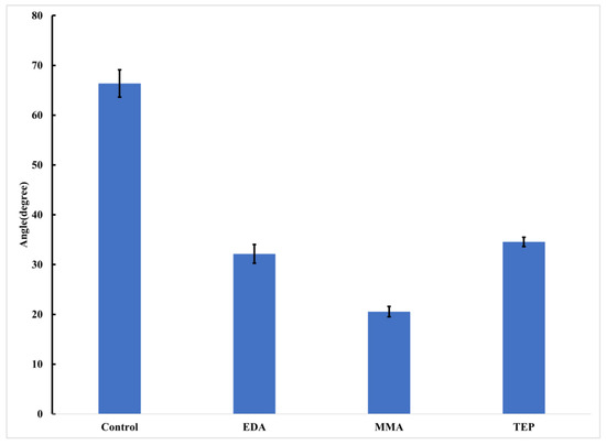 The experiment was designed to compare both the biomineralization effect on the PEEK surface and the cellular viability demonstrated by varying LTP. Utilizing different LTPs causes different functional groups to appear on the scaffold, but this also affects the wettability of the PEEK surface. The wettability of PEEK may directly affect osteoblastic adhesion, and as it has been shown, that decreased wettability of a scaffold surface impedes osteoblastic attachment on polymeric surfaces [44]. Water contact angle measurements showed an increase in wettability in all treatment samples compared to the control samples (Figure 2). The significant increase in nitrogen functionalization explains the wettability increase in EDA. The TEP sample was originally expected to increase the contact angle of the neat sample due to the increase in phosphate chemical functionalization. However, there is a decreased contact angle due to phosphate bonding with additional oxygen groups forming the PO43− ion, and the increased surface roughness from the plasma treatment [45]. A probable cause of the increased wettability of the MMA plasma-treated peak can be attributed to the significantly higher oxygen composition in comparison to the control PEEK scaffold shown in the XPS data in Table 1 and Table 2.