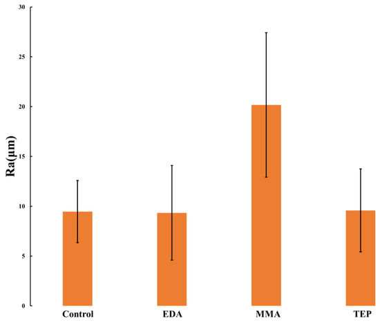 In addition to the increased oxygen composition of the MMA-treated PEEK sample, wettability is affected by the differing surface roughness for the PEEK sample resulting from the plasma treatment [40]. It was expected that MMA-treated PEEK would have a higher WCA than the rest of the PEEK samples, including the neat PEEK, due to its polymer counterpart being hydrophobic. Wettable materials are materials with a water contact angle < 90°. The surface wetness of a material can be increased via increasing the surface roughness. Analyzing the water contact angle together with surface roughness allows for a clear understanding of the effect of both the functional group change and surface roughness on wettability. In general, plasma treatment of polymeric samples increases the surface roughness of the material, and amongst wettable materials, this increased surface roughness causes increased wettability. Scaffolds treated with EDA did not show increased surface roughness, unlike all other plasma-treated scaffolds; however, nitrogen-attached functional groups, from plasma treatment with EDA, caused increased wettability for those scaffolds [46,47,48]. The chemical functionalization provided by LTP along with the surface roughness explains why all plasma-treated samples in this study had a significant decrease in water contact angle [49,50,51]. The Ra values of the different samples are displayed below in Figure 3.