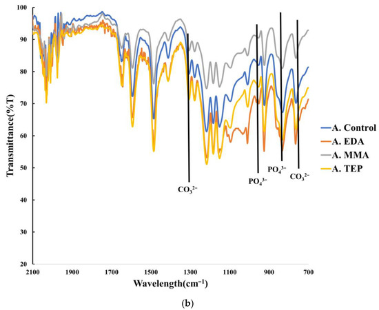 Querido’s experiment explains the relationship between crystallinity and FTIR peak appearance. He used the Pearson correlation coefficient and analyzed the correlation between the crystallinity of the CaP using the apatite peak found at about 1015 cm−1, showing that sharper and more intense peaks at this point signify higher levels of crystallinity of the CaP formation [54]. Thus, the FTIR spectra behaved in a manner predicted by the prior literature.