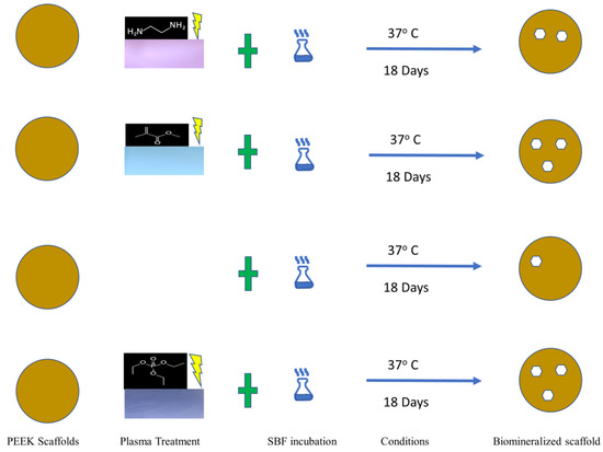 A total of 2 g of PEEK pellets were placed in between 2 aluminum cylinders and pressed into a circular scaffold at 354 °C and held for 1 min for the scaffolds to obtain a diameter of 8 mm. The cylinders were then removed and allowed to cool for 3 min before the scaffold was removed from between the cylinders. The scaffold was cut into several pieces, dimensions of 3 × 3 mm (about 0.12 in) and placed into the Harrick PDC-001 (Harrick Plasma Inc., Ithaca, NY, USA) and then treated with different plasmas on both sides of the scaffold for 30 min at 0.400 Torr. The PEEK materials were immediately placed in SBF solution, prepared according to ISO (International Standardization Organization) standard 23317 [41], scaled to a 1.5× concentration, and incubated for 18 days, avoiding the problems of hydrolysis, and maintaining the integrity of the apatite layer [42], where the solution was changed every 72 h.