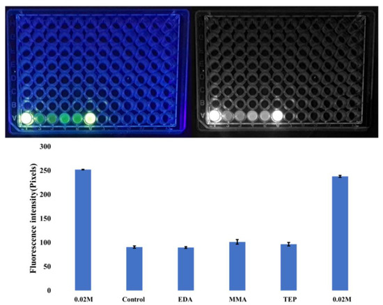 Fluorescence intensity of calcein staining with standard deviation shown by error bars where N = 6 for each sample. The fluorescent image of the 64 well plates show each of the 6 calcein stained samples, in direct coordination with and referred to in the graph.
