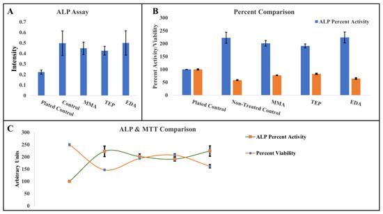 (A) Intensity display of ALP assay amongst all samples. (B) Display of MTT viability in terms of percentage. (C) Relationship in the MTT and ALP analyses.