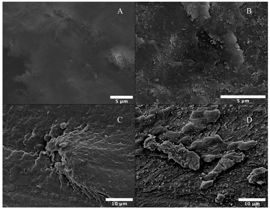Representative SEM images showing the morphology of biomineralized samples. (A) Control samples at 5000× magnification. (B) EDA sample performed at 10,000× magnification. (C) MMA sample at 3000× magnification. (D) Phosphate sample at 3000× magnification.