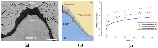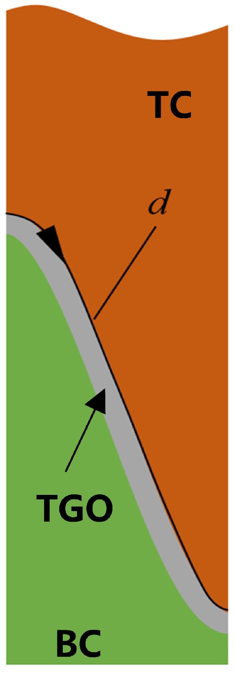 Thermal barrier coatings (TBCs) have been widely used as a more effective way to insulate heat to improve the efficiency of gas turbines. Typical TBCs generally consist of two layers: a ceramic topcoat (TC), which acts as a thermal insulator, and a bond coat (BC), which acts as an antioxidant layer [1,2,3]. During the service process, the TBCs will fail mainly in the form of coating peeling. Coatings prepared by atmospheric plasma spraying (APS) have a porous microstructure with low strain tolerance, and the internal holes play a role in promoting the emergence and propagation of cracks. When the interfacial cracks extend to a certain extent, the coating peels off. Many factors can result in the change in stress distributions: the plastic deformation of each layer [4,5]; creep at high temperatures [6,7,8]; ceramic sintering [9,10,11]; CMAS corrosion; and the impact of foreign objects [12,13,14]. The growth stress caused by thermally grown oxide (TGO) is the main cause of coating failure [15,16,17,18]. The appearance of the TGO layer occurs because ceramics barely hinder oxygen diffusion. At high temperatures, oxygen passes through the ceramic layer and chemically reacts with Al elements from the bonding coat, which will cause significant growth stresses on the TC/BC. At the same time, due to the large difference in physical parameters from the TC/BC, a large thermal mismatch stress can be also introduced. The growth of TGO is a chemical reaction resulting from the diffusion of elements. The thickness of TGO varies from area to area as a result of the diffusion process. The growth rate at the peak areas will be higher than in the valley areas, as shown in Figure 1. TGO is a new substance generated by a chemical reaction. The schematic diagram of the growth is shown in Figure 2. It is generally believed that it grows in two directions: the thickening direction and the lateral direction.