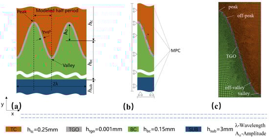 The geometric model used for this simulation is shown in Figure 4. The TBC system consists of four layers: a topcoat (TC) with a thickness of 0.25 mm; a bond coat (BC) with a thickness of 0.15 mm; thermally grown oxide (TGO) with an initial thickness of 0.001 mm; and a substrate (SUB) with a thickness of 3 mm. In this simulation, the TGO is considered to be uniformly dense a-Al2O3, which has been adopted by many authors [30,31]. In addition, the low content of spinel oxides in TGO during the early stages of oxidation has a complex effect on the failure of TBCs and has been temporarily neglected [32].