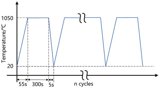 The user subroutine DLOAD is employed to apply a uniform temperature field across the model without heat transfer during temperature changes. Creep at high temperatures allows for the release of stresses in the TBC. For the initial unstressed temperature set to 1000 °C, the thermal history experienced by the whole model is shown in Figure 5. For a single cycle, it was increased from 25 °C to 1050 °C after 55 s, followed by a holding phase of 300 s, and then cooled down to 25 °C after 5 s. A total of 20 cycles is examined.
