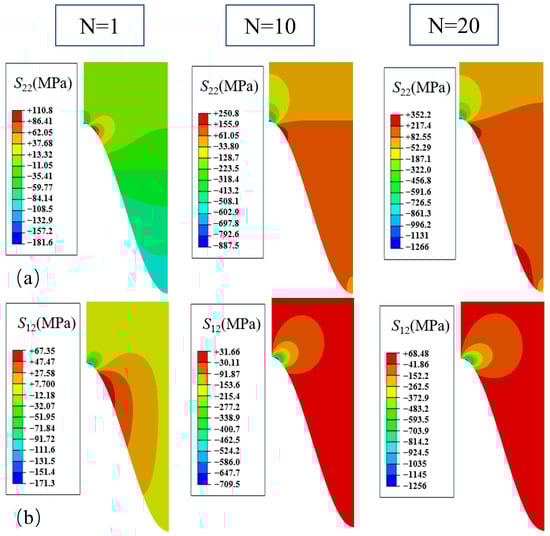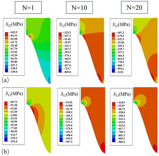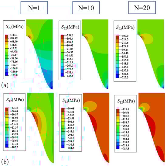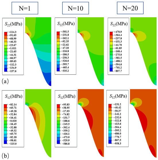 Stress distribution after considering the different numbers of cycles with non-uniform growth in the thickness direction: (a) normal stress; and (b) shear stress.