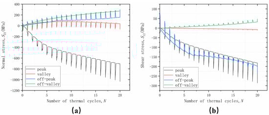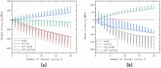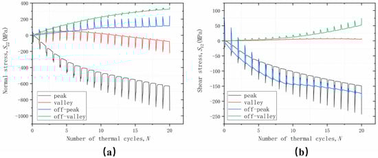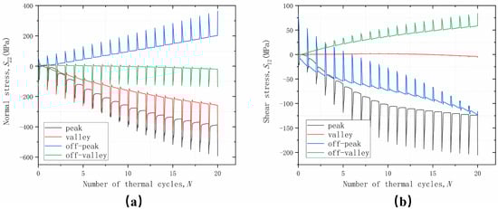 Considering the thickness and lateral uniform growth of different parts with thermal cycling stress variation curve:(a) normal stress; and (b) shear stress.
