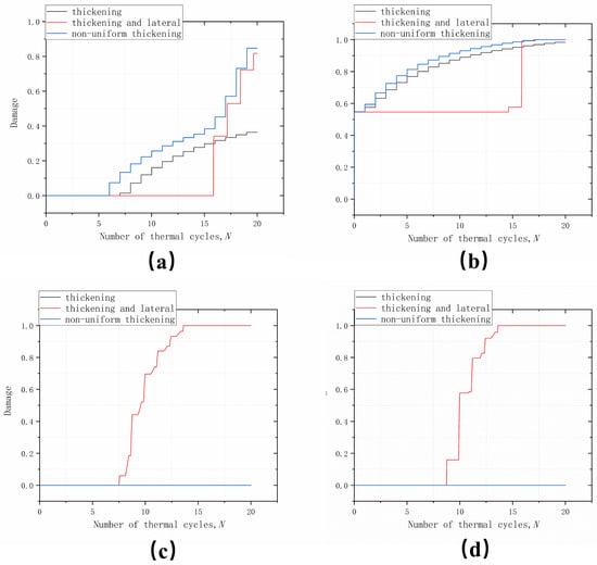 Four positions, peak, off-peak, off-valley and valley, were chosen to observe the change in damage with the number of cycles, as shown in Figure 12. In the peak area, as shown in Figure 14a below, the damage does not occur in the initial cycle. Rather, it occurs in subsequent cycles under the influence of the off-peak area. The analysis was performed using thickening growth as a baseline. The initial damage occurred after 7 thermal cycles for the thickening growth, while the thickening and lateral growth pattern delayed the damage to a greater extent, with the initial damage occurring after 16 thermal cycles. Considering the non-uniform growth pattern, the damage in the peak area was advanced, occurring after six thermal cycles. The trend of damage accumulation along the thickening growth was also more moderate, and the thickening and lateral growth pattern with non-uniform growth accumulated substantially after 16 thermal cycles. This was due to the fact that cracking had already occurred off-peak after 16 cycles.
